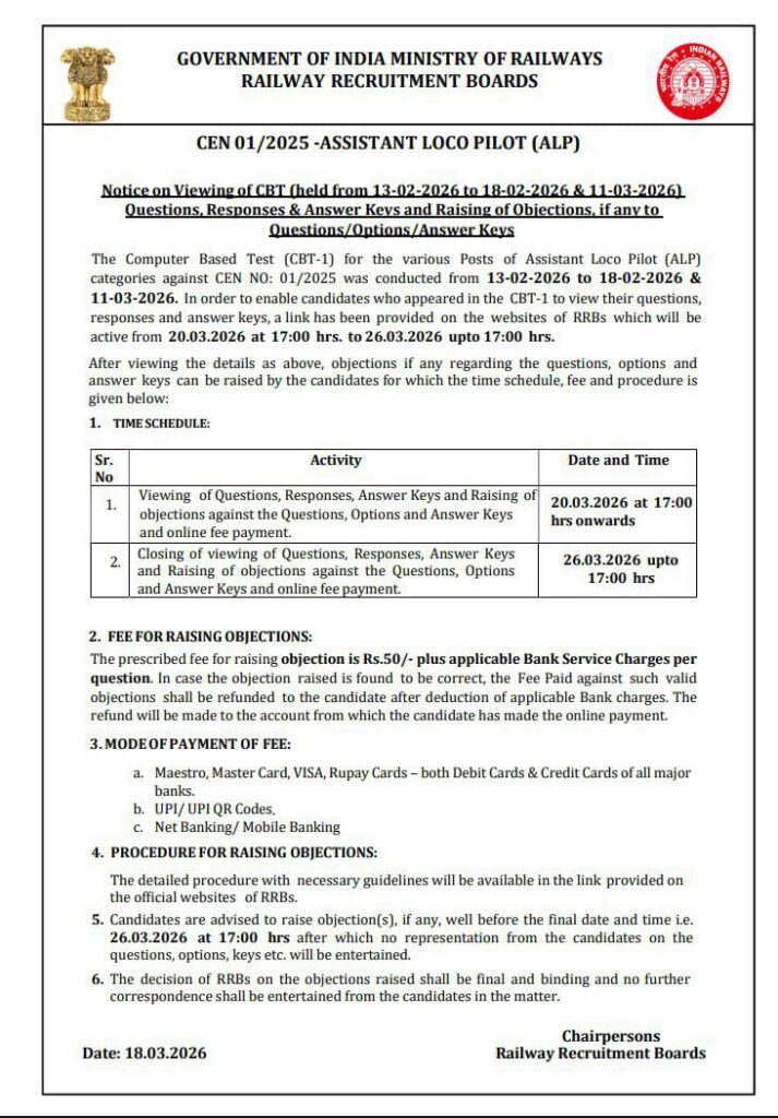 • RRB ALP 2025 Answer Key CBT1 20 मार्च 2026 को शाम 5 बजे जारी की गई।