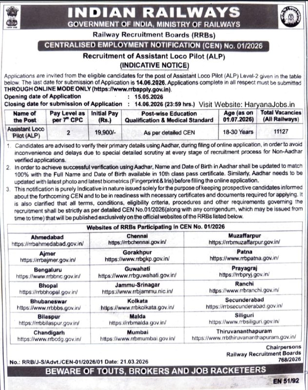 RRB द्वारा जारी नोटिस के अनुसार आवेदन प्रक्रिया मई 2026 से शुरू होगी।