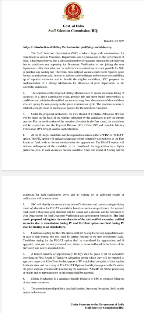 SSC Sliding Mechanism 2026 एक नई चयन प्रक्रिया है जिसमें खाली रह गई रिक्तियों को उसी परीक्षा चक्र में मेरिट और पोस्ट प्रेफरेंस के आधार पर दोबारा आवंटित किया जाता है।